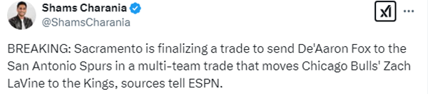最近一段时间,国王一直在积极兜售福克斯,后者把马刺列为最心仪的下家,经过一段时间的谈判,最终福克斯如愿加盟马刺,接下来他将联手文班亚马冲击季后赛。