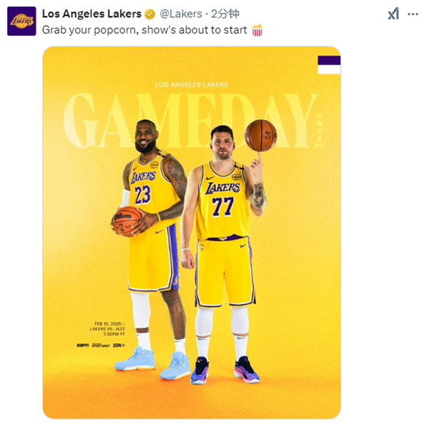湖人名宿魔术师发推写道:我真是太激动了,看到卢卡即将在对阵爵士比赛中迎来湖人首秀!洛杉矶现在真是热闹非凡,今天Crypto球馆是必去之地!