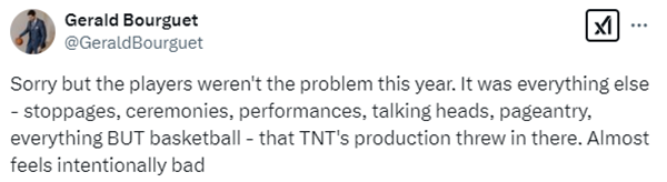太阳记者Gerald Bourguet点评:今年的问题不在于球员,而是其他一切——暂停、仪式、表演……除了篮球之外的一切——TNT 的制作都加入了其中。几乎感觉是故意搞砸的。