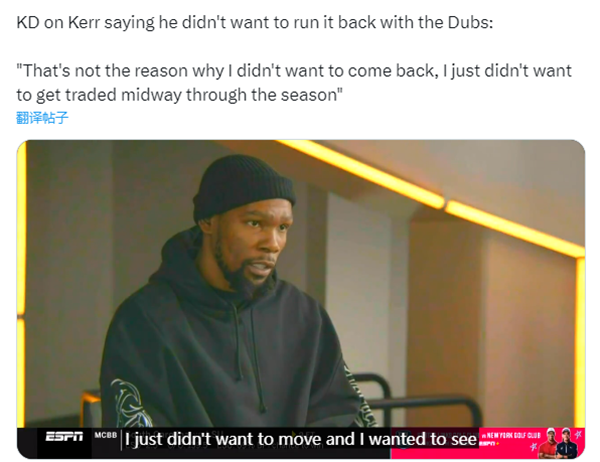 但杜兰特在采访中明确回应:“人们总是对我说一些离谱的话,可这并非我不想回去的原因。我只是单纯不想在赛季中期被交易,这和我在勇士的那段时光没有关系,也不是因为我不喜欢德雷蒙德(格林)。归根结底,我就是不想折腾,想和太阳队一起打完这个赛季,看看我们到底能取得怎样的成绩,我很高兴自己还留在这儿。”