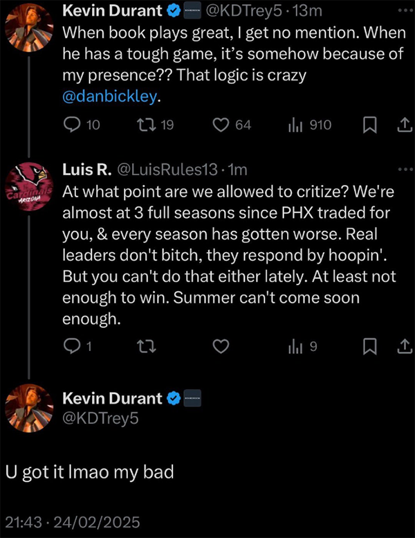 杜兰特发推回应体育主持人Dan Bickley,写道:当德文-布克打得好时,根本没人提到我。可只要他打得挣扎,却又被说成是因为我在场?这逻辑也太荒谬了吧。
