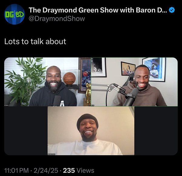 值得一提的是,杜兰特将做客参加追梦格林的播客,你觉得他们会聊点什么呢?杜兰特曾和追梦在勇士时期当过队友,一起夺得过总冠军,但两人发生了很多矛盾,追梦曾怒喷杜兰特:在你没来之前,我们就是总冠军了。