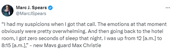 Marc J. Spears报道,克里斯蒂是在湖人和独行侠大交易曝光前的15分钟得知被湖人交易的,在独行侠惨败勇士赛后,克里斯蒂接受采访,谈到被交易后的真实反应,克里斯蒂表示:“接到那个电话时,我心里就有了猜测。”