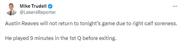 第一节最后3分钟,里夫斯意外受伤并且离场返回更衣室接受检查,之后湖人官方宣布,里夫斯右小腿酸痛,本场比赛不会回归。伤退前,里夫斯出战9分钟,4投2中拿到4分4篮板2助攻。