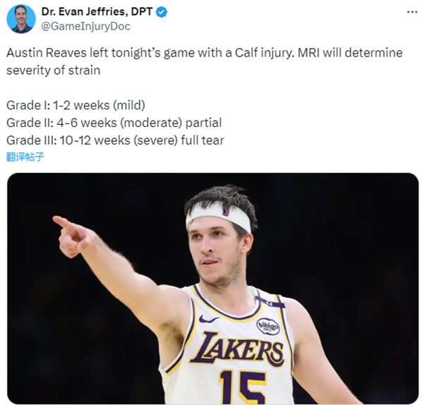对于里夫斯的伤情,医学专家Evan Jeffries表示,里夫斯因小腿受伤退出了今晚的比赛,MRI 将确定拉伤的严重程度;一级拉伤休战1-2周(轻度);二级拉伤休战4-6 周(中度);最严重三级拉伤需要休战10-12 周(完全撕裂)。