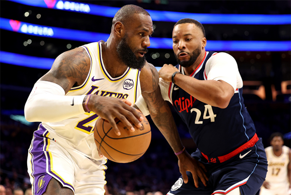末节被快船追到个位数后詹姆斯三分止血,东契奇三罚全中,克内克特输送三分,湖人再次拉开分差;快船6-0继续反扑追分,东契奇关键时刻,詹姆斯追身钉板大帽,裁判多次回放后,最终吹罚詹姆斯先碰到球,是一个好帽,快船连续错失三分,最终湖人惊险拿下胜利。