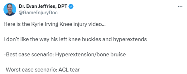 对于欧文的伤势,医学专家Evan Jeffries发推表示:我不喜欢他左膝弯曲、过度伸展的方式。最好的情况:过度伸展/骨头挫伤;最坏的情况是前交叉韧带撕裂。