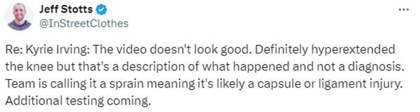 另一医学专家Jeff Stotts表示,从受伤画面来看,欧文的情况不太好,膝盖确实过度伸展,球队称这是扭伤,这可能意味着关节囊或韧带损伤。