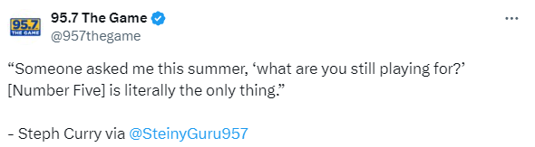 接受采访时,库里表示:“有人今年夏天问我‘你还在打球是为了什么?’ 第五个总冠军真的就是我唯一为之而战的目标,我喜欢我们球队现在的状态,我认为我们有能力做到这一点。”