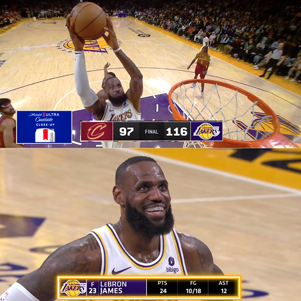 面对东部第三的骑士,湖人第一节与骑士对攻,第二节开局打出16-3攻势拉开分差,半场打完领先9分;下半场,湖人第三节被骑士16-4攻势反超,之后詹姆斯和浓眉带队19-0重新拉开分差,末节詹眉带队掌控比赛,最终稳稳拿下胜利。