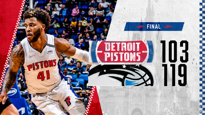 直播车 1月29日讯 NBA常规赛继续进行,魔术坐镇主场迎战活塞,两队为东部,也是全联盟倒数两名,此役格兰特等人继续缺阵。首节上来,小瓦格纳进攻状态出色,在禁区予取予求,带领魔术很快建立领先优势,康宁汉姆这边则出现失准,连续不中,节末哈里斯和奥基基带领魔术打出10-0,以39-19领先进入第二节。次节回到场上,活塞进攻回暖,逐渐蚕食分差,但魔术也总能给出回应,两队陷入拉锯战,节末约瑟夫中投准压哨命中,半场比赛结束,魔术67-51保持领先。易边再战,两队在对方禁区做文章,贝连续得分,班巴也在篮下连续完成吃饼,康宁汉姆在前12投全失后,终于上篮命中本场个人第一球,三节结束魔术92-75保持领先。末节上来,罗斯突然手感打开,连中三记三分,分差重新来到20分以上,此后两队交替取分,分差一直在20分上下浮动,活塞无力追回比分,最终魔术主场119-103大胜活塞。