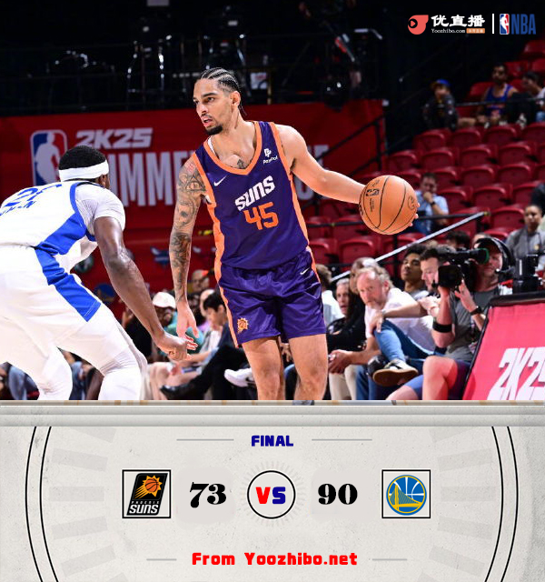 直播车讯 7月14日 NBA夏季联赛继续开打,太阳和勇士迎来一场交手,勇士方面仍然派出波杰姆斯基和戴维斯的“老带新”阵容,太阳则是新援罗迪带队。首节勇士在和太阳短暂纠缠后迅速接管比赛,后半段几乎弹无虚发轰出21-4的攻势直接拉开两位数分差;次节勇士虽然进攻端不如首节,但他们让对手5分钟里仅得5分的防守非常成功,这一节稳定的防守帮助他们取得17分的优势进入下半场。休息归来太阳虽然进攻端稍有回暖但依旧无法阻止对手,勇士第三节首发5人里4人得分上双完全控制着比赛节奏,末节分差拉大至20分以上后比赛也彻底失去悬念。最终,勇士轻取太阳拿下比赛。
