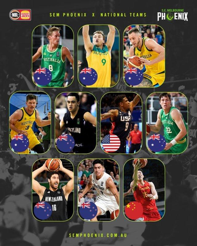 凤凰队晒出的10人阵容图里,5名球员现在或以前效力过澳大利亚国家队,3名球员来自新西兰国家队,1名球员曾效力美国国家队,还有就是周琦,他是中国国家队的成员。效力过美国国家队的是芒福德,他曾在2017年代表美国男篮参加美洲杯,并获得了冠军。