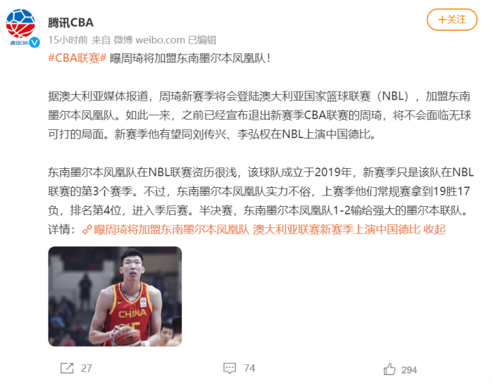 来源:直播车09-07 10:20直播车9月07日讯,重磅新闻,美国名记Marc Stein报道,消息人士透露,周琦确定将加盟NBL墨尔本凤凰队。