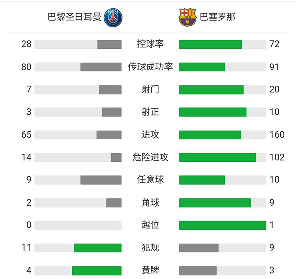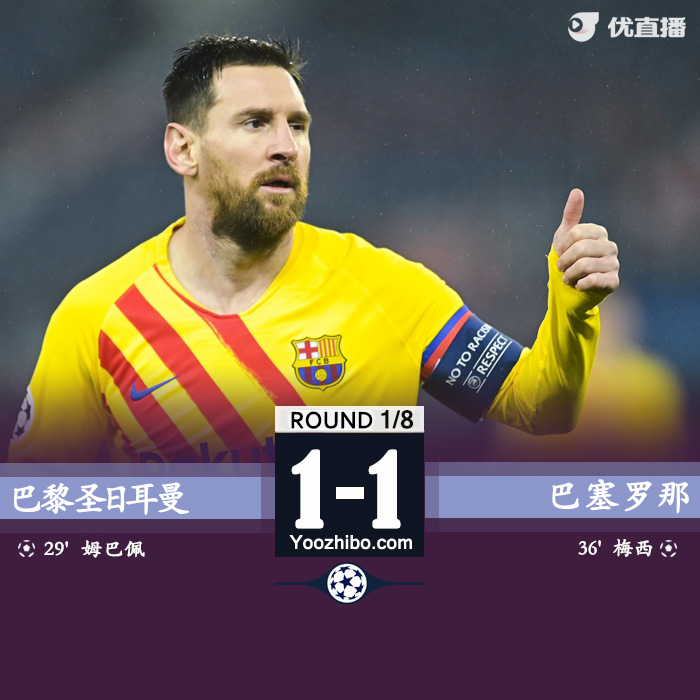 全场比赛结束,最终巴黎1-1,总比分5-2淘汰巴萨晋级八强。
