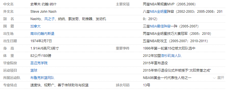 史蒂夫·纳什在1996年NBA选秀中于第1轮第15位被菲尼克斯太阳队选中,1998年加盟达拉斯小牛队,2004年重回太阳队,在2005-06连续2年荣膺NBA常规赛MVP,2012年签约洛杉矶湖人队。8次入选NBA全明星阵容,7次入选NBA最佳阵容(3次一阵,2次二阵,2次三阵),5次荣膺NBA助攻王,2次夺得NBA全明星技巧挑战赛冠军,2007年荣获詹姆斯·沃尔特·肯尼迪公民奖,4次入选“5-4-9俱乐部”(2分球命中率50+%;3分球命中率40+%;罚球命中率90+%)。