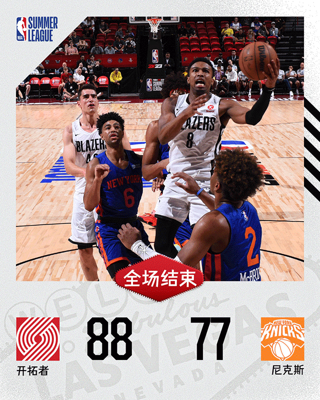 直播车7月12日讯 拉斯维加斯夏季联赛继续开打,开拓者和尼克斯迎来一场交手。首节对决开拓者完全不在状态单节仅得9分,而尼克斯这边早早进入状态迎来13-0的完美开局,这波进攻也帮助他们在首节拿到15分领先;然而次节轮到尼克斯熄火,开拓者开局不久送出19-4的攻势追上比分,末段又抓住对手罚球不中的机会实现弯道超车反超1分进入下半场。第三节双方争夺主动权都拿到过领先,不过最后时刻开拓者以一波10-0的攻势夺回领先进入末节决战,第四节争夺开拓者在拉锯战中笑到最后,他们节中连续开火将优势扩大至两位数奠定胜局。最终,开拓者击败尼克斯拿下比赛,而尼克斯没能延续自己夏联的不败金身。