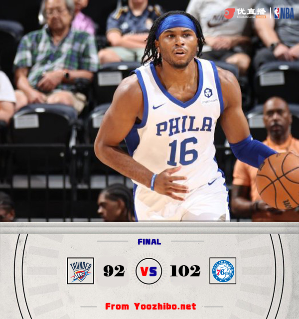 直播车讯 7月9日 NBA盐湖城夏季联赛,雷霆今日对阵76人。比赛上来,雷霆就率先进入状态打出10-2的开局取得领先,不过及时调整的76人在首节后半段逐渐追了回来,首节双方战至26-26平,次节双方依旧是大打对攻战,但76人显然攻势更猛单节砍下32分,半场结束时雷霆落后7分;下半场回来,双方的命中率都出现下降,不过分差一直保持在十分左右,到了末节76人率先找回进攻感觉,他们没有给雷霆任何迫近比分的机会,最终76人轻取雷霆迎来开门红。