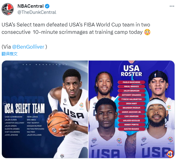 美国男篮选拔队也拍摄合影,活塞状元坎宁安抱球坐在C位,杰伦-格林坐在第一排满脸笑容,雷霆榜眼霍姆格伦站在第二排;据报道,在今天的10分钟训练赛中,选拔队两次击败美国男篮世界杯阵容。