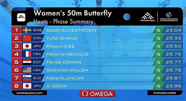 张雨霏出发反应用时为0.67秒,50米蝶泳直接冲刺,考验的是反应、速度和爆发力,最终张雨霏第一个到边,成绩是,恭喜张雨霏晋级到半决赛。