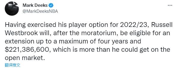 来源:直播车06-30 11:11直播车06月30日讯 ,据NBA分析师Mark Deeks报道,在执行下赛季球员选项后,威少将有资格与湖人签下4年2.21亿美元的顶薪提前续约合同,这比他在自由市场上能获得的合同更大;威少该合同最后一年的年薪将达到6127万美元,但是考虑到届时工资帽也将上涨,这份年薪的大小暂时无法衡量。