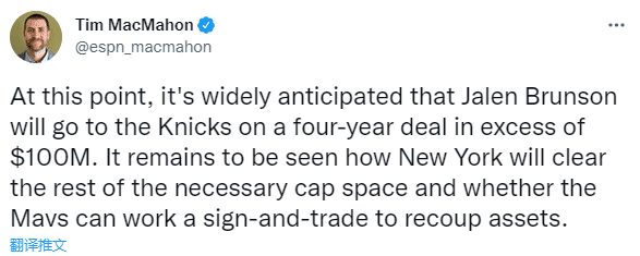 尼克斯疯狂追求独行侠二当家,根据记者MarcStein报道,独行侠内部愈发认为杰伦-布伦森的首选是尼克斯;根据之前的报道,独行侠愿意为布伦森提供一份类似范弗利特与猛龙的合同(4年8500万美元),但独行侠拥有鸟权,可以和布伦森签约5年。