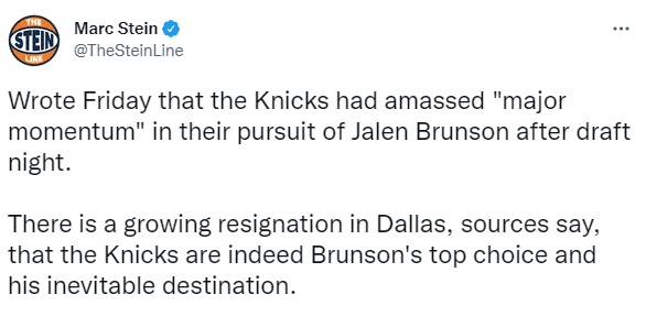 除了薪资空间之外,据体育画报记者Chris Mannis报道,为了追求布伦森,尼克斯还承诺让其担任球队的主力控卫;在达拉斯独行侠,布伦森和东契奇共同担任控卫,而在尼克斯,布伦森将掌控该位置。