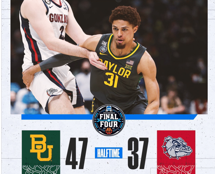 下半场开始,贾里德-巴特勒轰进三分球,阿亚伊上篮打进,贾里德-巴特勒再中三分球,萨格斯上空篮命中,戴维恩-米切尔突破得分。萨姆巴两罚中一,萨格斯上篮打进,随后萨格斯打成2+1,查楚阿篮下暴扣,安东-沃特森两罚全中,南哈德打板命中,维特尔上篮得分,贾里德-巴特勒两罚全中,贝勒大学62-49冈萨加大学。提米放篮成功,马西奥-蒂格上篮打进,弗拉格勒命中三分球,贝勒大学67-51打停冈萨加大学。