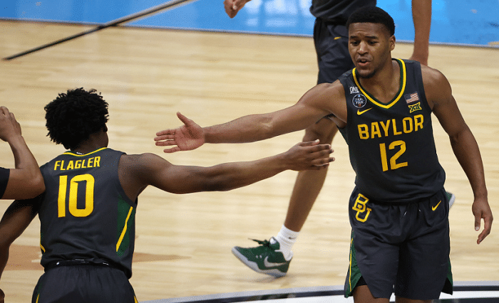 阿亚伊打板命中,贾里德-巴特勒两罚全中,梅耶翻身小跳投命中,戴维恩-米切尔两罚全中,贝勒大学第一次领先20分。萨格斯三分命中止血,萨姆巴两罚全中,萨格斯三分再中,萨姆巴第五次犯规下场。基斯珀特三分命中,弗拉格勒两罚全中,萨格斯被违体,他两罚中一。马西奥-蒂格打板命中,阿亚伊受伤下场,弗拉格勒两罚中一。之后贝勒大学一直保持领先,他们成功击败冈萨加大学,勇夺校史首冠。