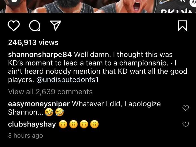 与此同时他还讽刺杜兰特在10年时曾不满詹姆斯去热火抱团“现在每个人都想去热火和湖人打球了?让我们找回竞争、互相针对啊。”对此杜兰特在相关新闻下回复“不管我做了什么,我都向你道歉……”其实就该名嘴的抨击来说,杜兰特没什么好争辩的!