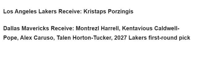 先来看看这笔方案,湖人送出哈雷尔、波普、卡鲁索、霍顿-塔克和2027年湖人的首轮签,得到独行侠的波尔津吉斯。这样5换1,湖人的损失未免也太大了。那么美媒为什么认为湖人该做这笔交易呢?