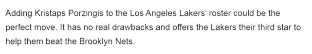 FW认为篮网的最大弱点就是在内线,即便他们签了格里芬,也不能改变这一点。波尔津吉斯和浓眉都是能内能外的大杀器,他们将统治小乔丹和格里芬。FW指出:“在湖人的阵容里加入波尔津吉斯是完美的运作。它没有真正的弊端,能为湖人带来第三位球星,帮助他们战胜布鲁克林篮网。”