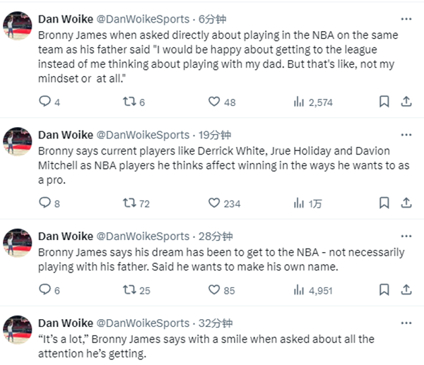 布朗尼还说他的梦想一直都是进入NBA,而不一定非要和父亲一起打球,他想靠自己打出名气。当被直接问及是否愿意与詹姆斯在同一支球队打NBA时,布朗尼表示:我很高兴能进入联盟,而不是想着和我爸爸一起打球,那根本不是我的心态。