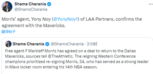 来源:直播车09-08 12:02直播车讯 北京时间9月8日,据名记shams报道,35岁的自由球员前锋马基夫-莫里斯已经同意与独行侠达成一份合同,作为上赛季的西部冠军,独行侠优先考虑与其续约;大莫将在独行侠开启生涯第14个赛季,预计他将继续担任球队更衣室领袖的角色。
