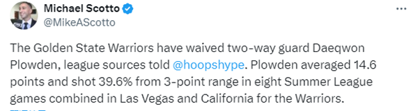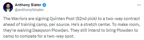 勇士跟队记者Anthony Slater报道,勇士裁掉普劳登是为了腾出位置,然后用双向合同签下今年52号秀昆顿-波斯特,虽然普劳登被裁,但勇士仍计划让他参加训练营,竞争一个双向合同的位置。