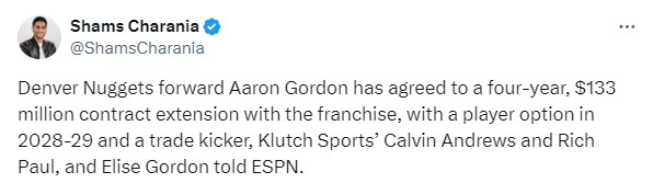 本来戈登可以和掘金提前续签4年1.5亿美元的顶薪合同,但掘金不愿意给这么一份合同,双方最终折中达成了提前续约协议——4年1.33亿美元(执行球员选项+3年顶薪)。