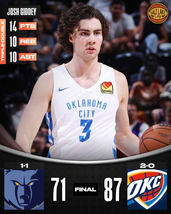 直播车讯 7月7日讯 NBA犹他夏季联赛继续进行,雷霆对阵灰熊。昨天的比赛里,新科榜眼霍姆格伦的首秀非常精彩,他也带队大获全胜,灰熊则是全民皆兵险胜76人。一开场,灰熊连中三分取得领先,雷霆内外开花打出11-0的攻击波后灰熊回敬10-2的小高潮,双方20平结束首节。次节上来,雷霆多点开花取得领先,灰熊一波9-2一度反超,基迪和霍姆格伦联手拿到10分帮助雷霆以48-43领先结束上半场。易边再战,雷霆牢牢占据场上主动,再度轰出10-0的攻击波,三节打完雷霆领先15分。第四节,灰熊展开反击努力缩小分差,基迪带队稳住局势并将优势保持到了最后,最终,雷霆轻取灰熊,取得2连胜。
