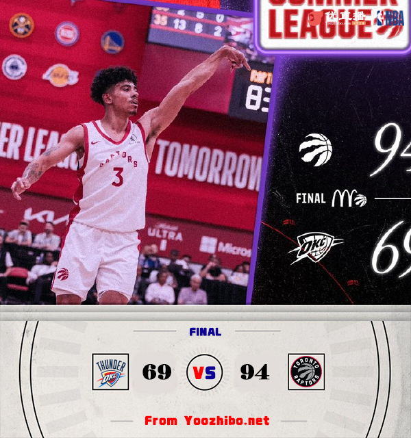 直播车讯 7月14日讯 NBA夏季联赛,雷霆对阵猛龙。开场后猛龙打出10-1的开局,首节雷霆进攻手感不佳,猛龙单节建立起20分优势。第二节两队进攻效率都一般,猛龙没有给雷霆缩小分差的机会。易边再战,雷霆依靠弗拉格勒和琼斯的发挥将分差缩小到10分左右,迪克手感不佳频频打铁,不过第四节猛龙再次将比分拉开,最终猛龙94-69轻松击败雷霆。
