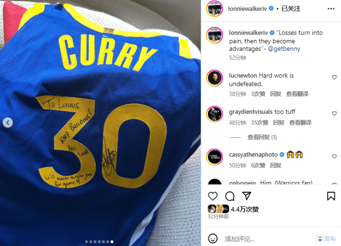 湖人后卫朗尼-沃克晒出了一件库里送给他的签名球衣,球衣上库里给沃克写道:“致朗尼:继续磨炼!另外,因为G4我永远不会原谅你……”