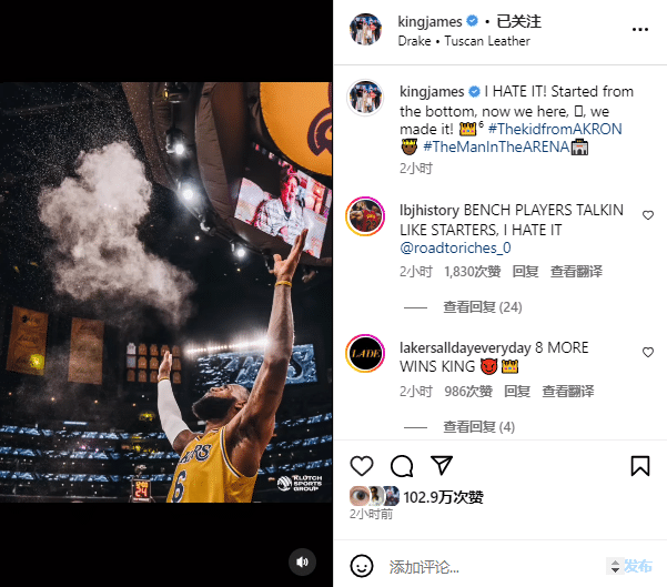 詹姆斯在Ins晒出对阵勇士的赛前和赛场照,配文写道:我讨厌它!从底层开始,现在我们在这儿,我们做到了!(6号王冠表情);在图集的背景音乐中,詹姆斯用的是德雷克的歌曲《Tuscan Leather》,歌词内容是“替补球员就像首发一样说话,我讨厌它!”