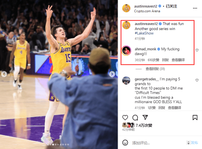 里夫斯晒出自己在湖勇G6投进半场压哨三分的画面以及其他赛场照,配文写道:这太有趣了,又是一轮很棒的系列赛胜利。