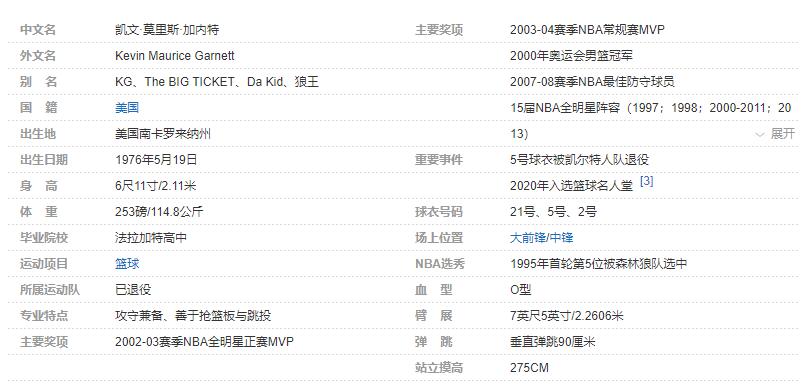 凯文·加内特(Kevin Garnett),1976年5月19日出生在美国南卡罗来纳州,前美国职业篮球运动员,司职大前锋/中锋,绰号狼王(森林狼时期)、KG(名字缩写)、The BIG TICKET、Da Kid。个人简介: