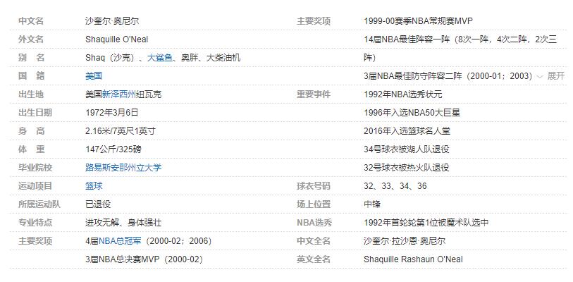 沙奎尔·奥尼尔(Shaquille O'Neal),1972年3月6日出生于美国新泽西纽瓦克,前美国职业篮球运动员,司职中锋,小名“沙克”(Shaq),绰号“大鲨鱼”。个人简介: