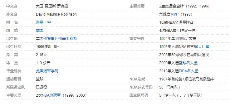 2013年5月28日,大卫·罗宾逊入选FIBA名人堂。“海军上将”是首位参加了三届奥运会的美国球员,他保持着美国奥运男篮的篮板与封盖纪录,是美国奥运男篮得分榜第2位。FIBA将其形容为“最能代表美国篮球于世界舞台形象的球员之一”。