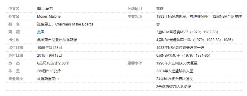 摩西·马龙(Moses Malone,1955年3月23日—2015年9月13日),出生于美国弗吉尼亚州彼得斯堡,前美国职业篮球运动员,司职中锋。个人简介: