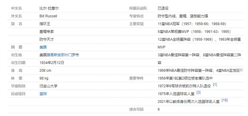 比尔·拉塞尔(Bill Russell),1934年2月12日出生于美国路易斯安那州门罗市,前美国职业篮球运动员、教练员,司职中锋,因其球员生涯获得11枚NBA总冠军戒指而绰号“指环王”,是20世纪60年代波士顿凯尔特人队的主力中锋,也被认为是NBA历史最出色的防守型中锋。个人简介
