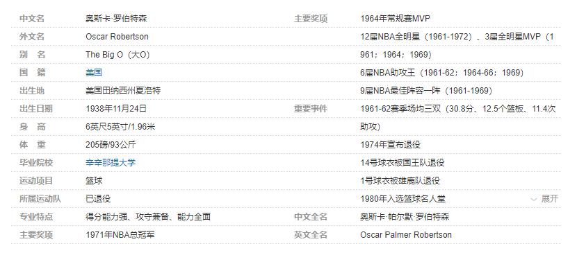 奥斯卡·罗伯特森(Oscar Robertson),1938年11月24日出生于美国田纳西州夏洛特,前美国职业篮球运动员,司职控球后卫,绰号“大O”(The Big O)。个人简介
