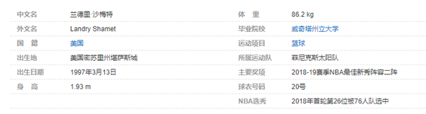 兰德里-沙梅特(Landry Shamet),1997年3月13日出生于美国密苏里州堪萨斯城(Kansas City, Missouri),美国职业篮球运动员,司职控球后卫,效力于NBA菲尼克斯太阳队。2018年通过选秀进入NBA,先后效力于费城76人队、洛杉矶快船队、布鲁克林篮网队和菲尼克斯太阳队,