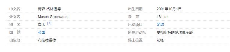 梅森-格林伍德(Mason Greenwood),2001年10月1日出生于英国布拉德福德,英国男子职业足球运动员,司职右边锋,亦可胜任中锋和左边锋,现效力于英超的曼彻斯特联足球俱乐部。