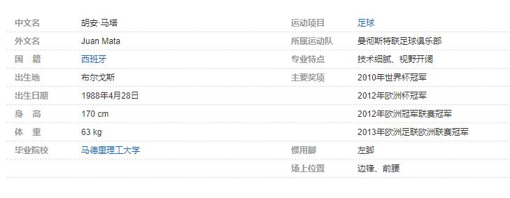 胡安-马塔(Juan Mata),全名胡安·曼努埃尔·马塔·加西亚(Juan Manuel Mata García),1988年4月28日出生于西班牙布尔戈斯,毕业于马德里理工大学,西班牙足球运动员,场上司职前腰/边锋,现效力于英格兰超级联赛的曼彻斯特联足球俱乐部。个人简介: